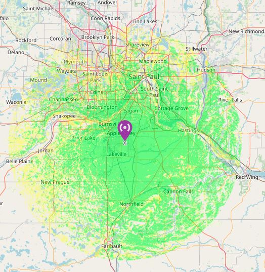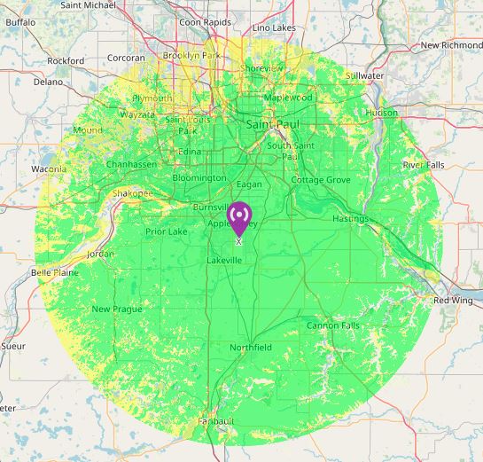 Welcome to the south metro’s second GMRS repeater. The Lakeville, MN repeater is not too far from the Farmington repeater in location, and many of us can be found on either one of the two excellent repeater systems. This repeater has has excellent coverage too, but just slightly less than the Farmington repeater.